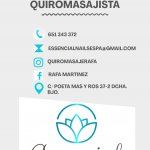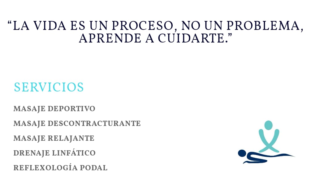 Para cualquier situacion de estres, dolencias, contracturas o simplemente te apetece cuidarte ,ofrezco servicios de quiromasaje deportivo, tratamiento de lesiones, masaje relajante, descontracturante,punto gatillo,vendaje neuromuscular, kinesiotape, drenaje linfatico, masaje facial y para tratamientos de estetica aprovecha nuestros masajes reductores con la tecnica de maderoterapia. Aprende a cuidarte y no dudes en pedir cita o llamar para cualquier consulta. Estamos para ayudarte. 651343372. Horario de atencion: lunes a sabado 9:00 a 21:00 y atencion a hoteles y domicilio . Cumplimos con todas las medidas sanitarias e higienicas.