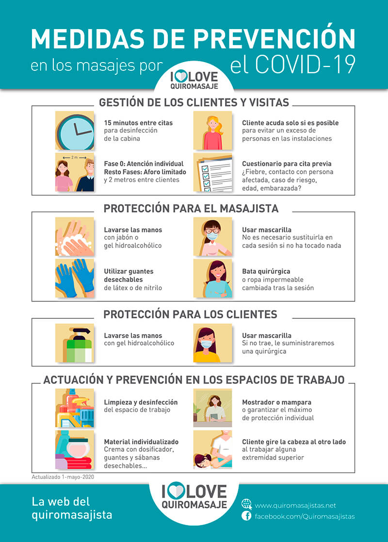 Estas son las claves para una correcta sesión de quiromasaje, con todas las medidas de precaución posibles. Según avance la investigación de una vacuna, seguramente reduciremos estas medidas, pero algunas ya quedarán pasa siempre.